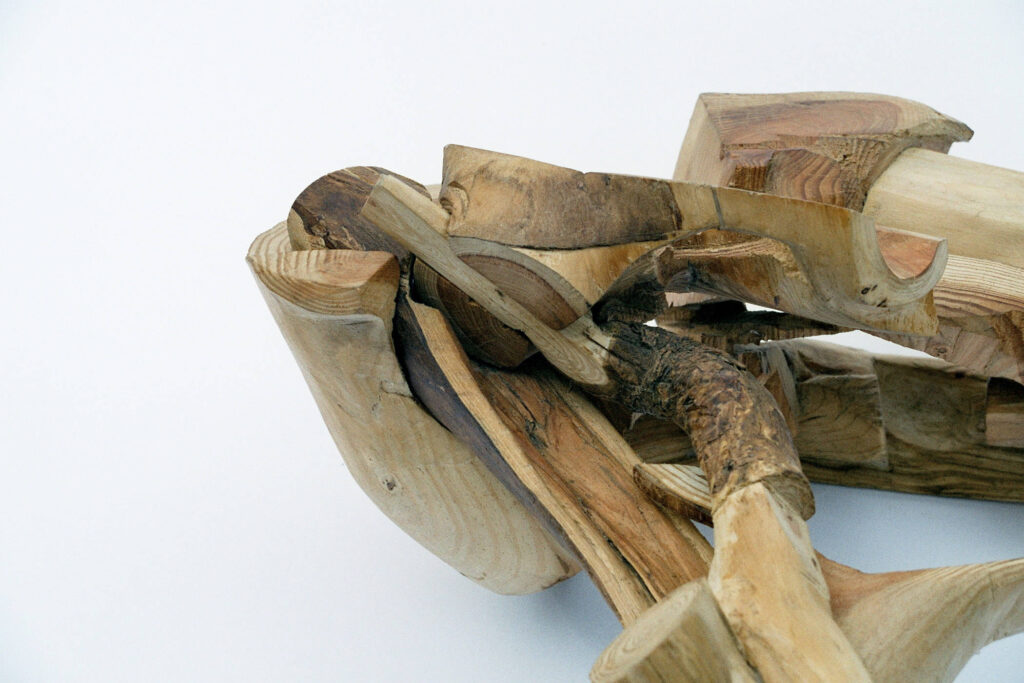 Za najbardziej zaawansowaną i cielesną rzeźbę wykonaną w konwencji analitycznej uważam pracę Cicha pozycja z 2002 roku, w której nawet kolor drewna został dobrany do „mięsnych” skojarzeń. Przewodnią myślą było wyrażenie wewnętrznych napięć ciała (miednica i noga) w układzie dość statycznym, gdzie mięśnie ulegają jednak stopniowemu skręcaniu i rozciąganiu. Była to jedna z moich nieco utopijnych prób jednoczesnego ukazania wewnętrznych i zewnętrznych jakości struktury. Porządkującej siły konstrukcji i piękna organicznej, „cielesnej” powierzchni7. Rzeźba ta w zasadzie zamknęła moją przygodę z tą metodą pracy.